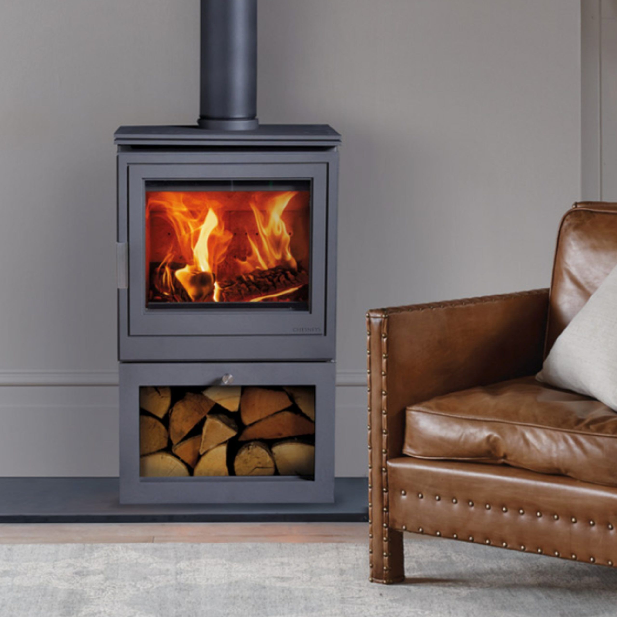 Instead of a masonry chimney, the stove is connected to a twin-wall insulated flue that safely vents smoke outside the property. This system is designed specifically for properties without a chimney.